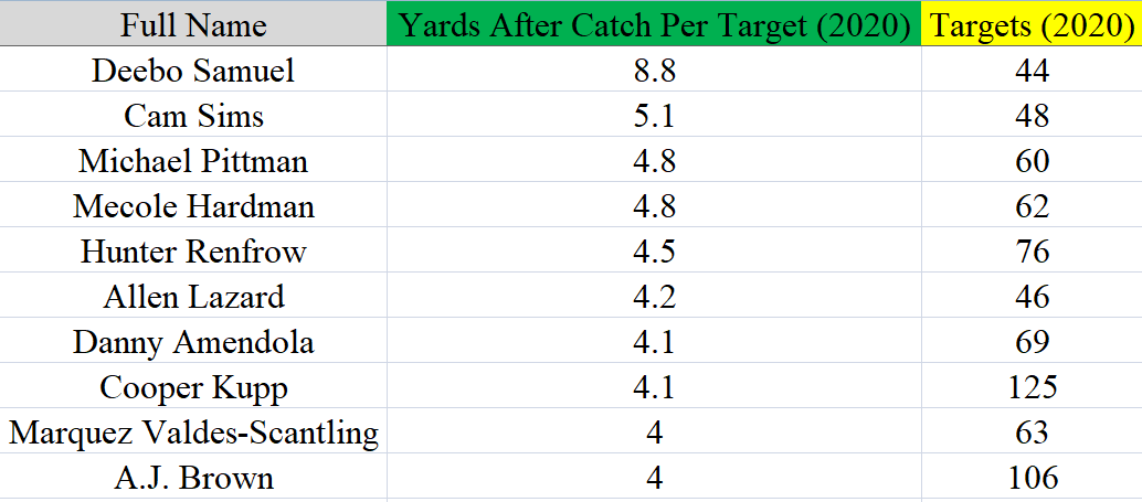 Pittman averaging 4.8 (No. 3) Yards After Catch per Target among wide receivers with at least 40 targets is a notable metric from last season. Wentz averaged 2.58 (No. 74) Receiver YAC per Target in 2020 and will welcome a wide receiver that can create after the catch.