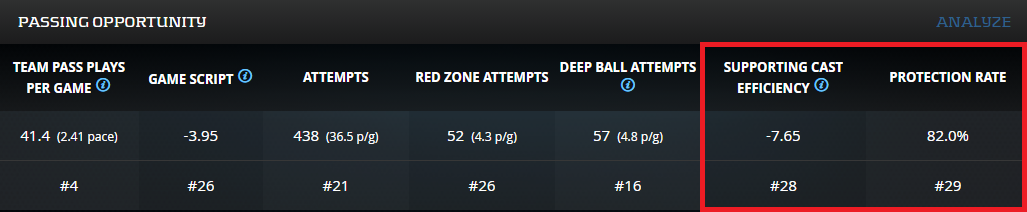 Wentz did not receive help from the team in his 12 starts. His -7.65 (No. 28) Supporting Cast Efficiency mark and 82.0-percent (No. 29) Protection Rate highlighted the revolving door of players to start on the offensive line and the skill positions on offense. This does not excuse the 42 (No. 4) Danger Plays or 30 (No. 2) Interceptable Passes. When going back to 2019 though, Wentz made the same risky plays, evidenced by his 45 (No. 5) Danger Plays and 25 (No. 11) Interceptable Passes. The risky plays appear habitual and won’t go away, but the talent and situation around him will be improved in Indianapolis.