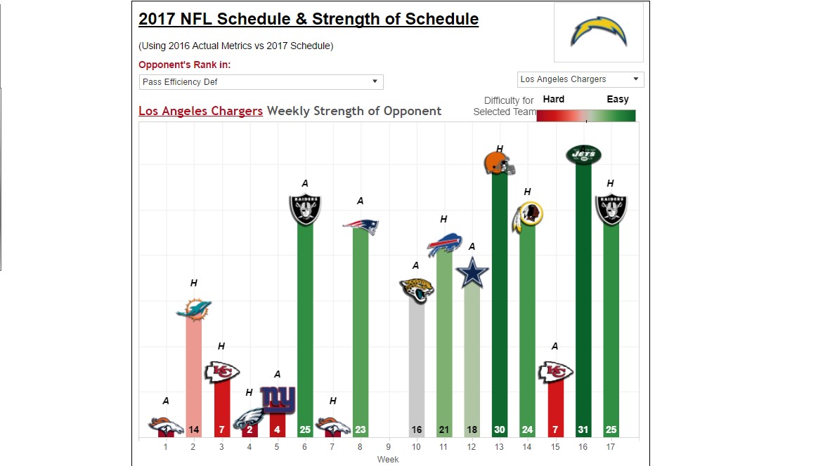 In a word, schedule. The Chargers play the tenth toughest schedule of opposing defenses. Part of this is a natural byproduct of playing the Chiefs and Broncos twice every year. However, as you can see, their schedule lightens up considerably in terms of their passing game after week 5. Buying the Chargers in fantasy right before their bye seems like an excellent in-season strategy for 2017.