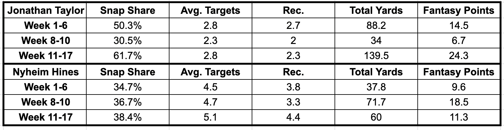 Arguably one of the most frustrating running backs in start/sit decisions is Nyheim Hines. It often felt like we sat him when he balled out and started him when he gave us single-digit fantasy points. In Week 8, Hines scored 21.2 (No. 5) Fantasy Points and then 5.8 (No. 47) the following week. Then in Week 10, he exploded for 28.5 (No. 3) Fantasy Points and followed that up with 6.3 (No. 39) in Week 11. He then rewarded his managers with double-digit fantasy points in five out of the final six games. There’s no blaming anyone that struggled with start/sit decisions involving him.