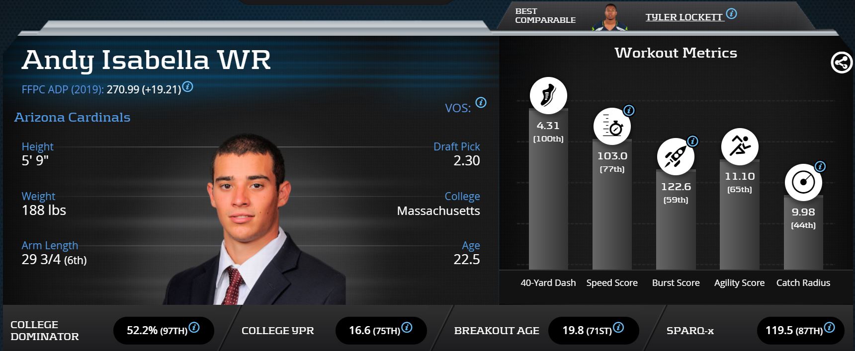 Isabella’s college profile is jaw-dropping. He’s one of just 23 receivers in Player Profiler’s database at the 70th-percentile or higher in college yards per reception, Breakout Age, College Dominator, and SPARQ-x score.