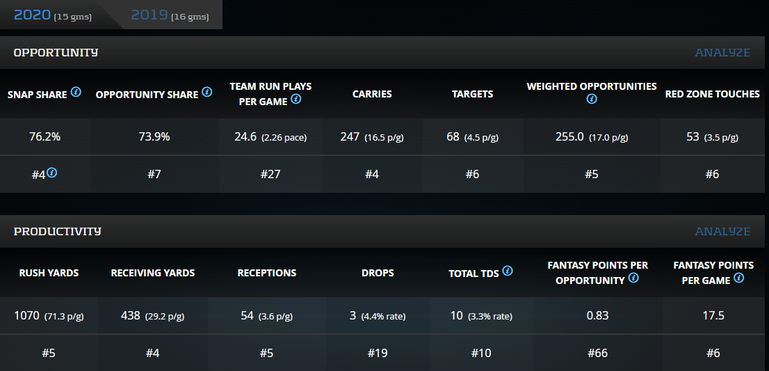 In 2020, David Montgomery paid dividends to those who took a chance on him. The second-year back finished No. 4 in total PPR fantasy points after finishing No. 24 in his rookie campaign. He ranked No. 6 or higher in several RB opportunity metrics this past season, including Snap Share (No. 4), Carries (No. 4), Targets (No. 6) and Red Zone Touches (No. 6). The same goes for his production categories; No. 5 in Rush Yards, No. 4 in Receiving Yards and No. 6 in Fantasy Points per Game.