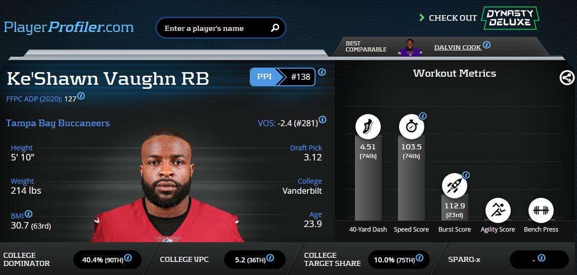 Ke’Shawn Vaughn and Bryan Edwards are players that had moderate expectations going into their rookie seasons. The year didn’t go as planned for either, but 2021 presents an opportunity for both to redeem themselves. Edwards will walk into a less crowded receiver room with opportunity abound. His lack of workout metrics does raise some questions, but his stellar College Dominator Rating and Breakout Age suggest there’s no reason to bail on him yet.