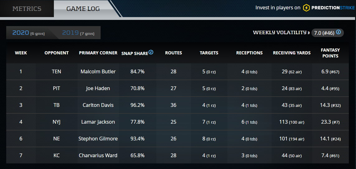 Jakobi Meyers is a high-floor option at receiver with little competition in New England. He has filled in admirably for Julian Edelman and will continue to see 6-10 targets per game.