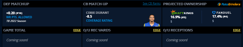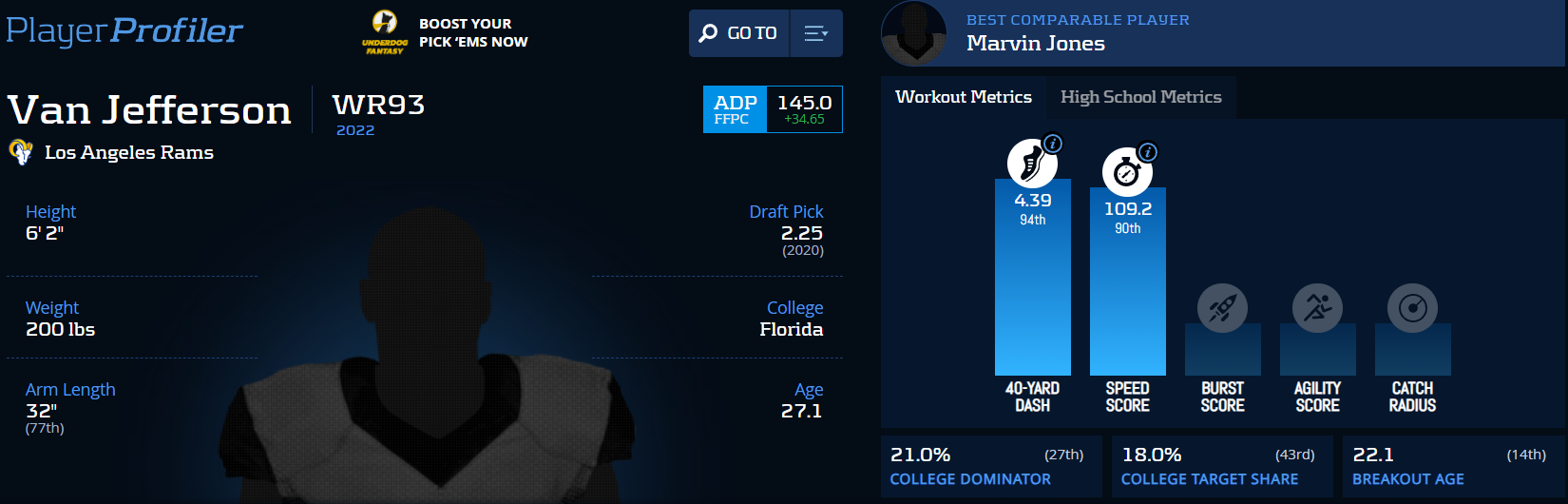 If Cooper Kupp is out, and Jefferson is at minimum salary, he is a player we will need to strongly consider. I don’t care that he has been a subpar NFL receiver. The salary savings will set up the rest of our lineup to be full of top end talent. He also was a second-round draft pick and had over 1,000 Air Yards in 2021. Bottom line: Opportunity > Efficiency.