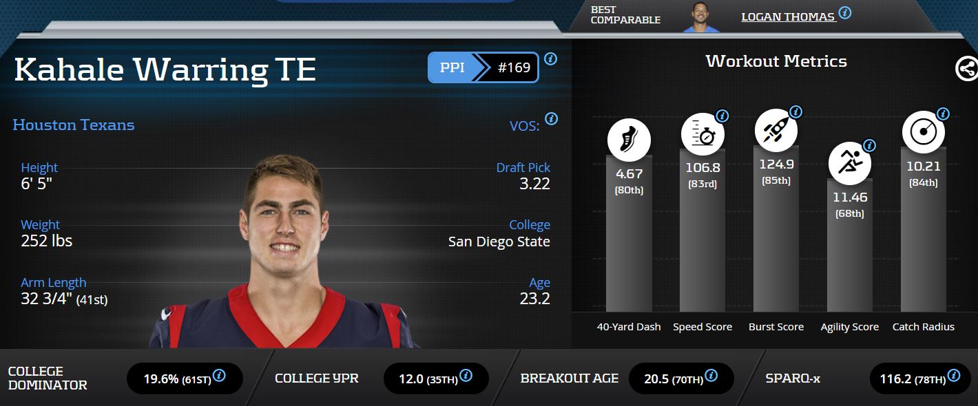 Warring, on the other hand, has impressive workout metrics across the board, highlighted by a 19.6-percent (61st-percentile) College Dominator Rating and 20.5 (68th-percentile) Breakout Age. There is a lot to like about Warring, and whether it’s Deshaun Watson or another quarterback, the new coaching staff in Houston would be wise to get the third year tight end more involved. Get him on those benches!!!