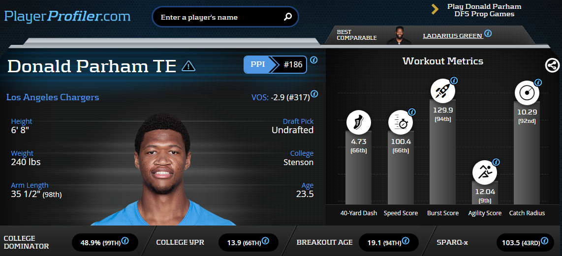 Donald Parham is an obvious choice here; Hunter Henry will hit the open market during the offseason and the Bolts need playmakers around young quarterback Justin Herbert. They need look no further. While Parham only has above-average speed, he boasts a 129.9 (94th-percentile among qualified tight ends) Burst Score with a 10.29 (92nd-percentile) Catch Radius. The former XFL stud registers at 6-8 and 240-pounds, with an Arm Length in the 98th-percentile. Behemoth?