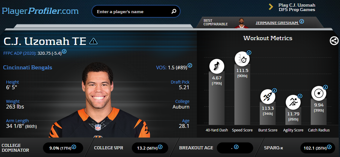 C.J. Uzomah was clearly a Burrow favorite early in the 2020 season before he went down with an Achilles injury. Through the first two weeks, he accumulated eight catches off of eleven targets for 87 yards and a touchdown. The Auburn product has a bit more speed than Sample, but displays less agility and is three years older. Either way, one of these two will see a healthy dose of targets come next season.