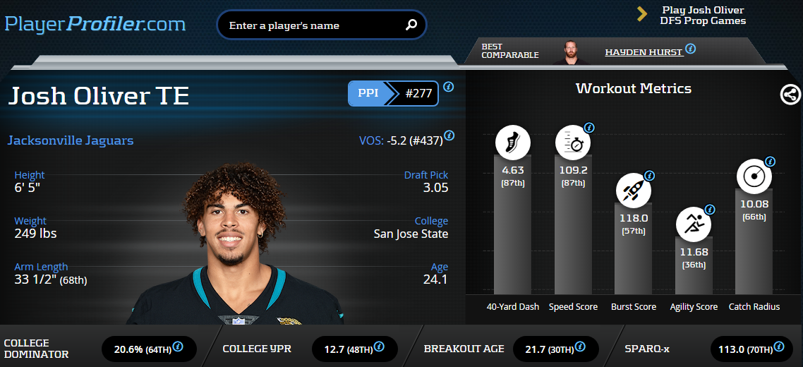 The 24-year old’s player profile is intriguing. At 6-5 and 249-pounds, Oliver ranks in the 87th-percentile in both 40-yard Dash time and Speed Score. Though he didn’t receive a heavy Target Share during his time at San Jose State, it’s important to note the subpar quarterback play he relied upon. The team won one game in 2018, Oliver’s final season. Health may be the issue, but should he manage that, the young tight end should become a special friend to the new face of the franchise.