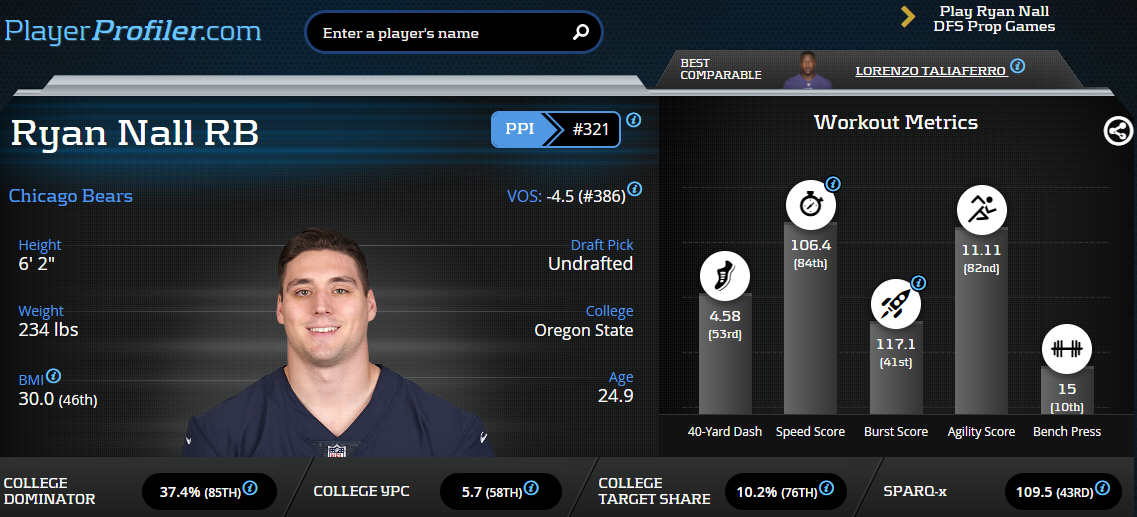 With prototypical size and speed to go along with exceptional weight-adjusted agility and pass-catching acumen, all Nall lacks is pro experience. Though it’s promising that he logged four catches for 35 yards and a touchdown in the fourth quarter during last week’s comeback attempt against the Titans. Lamar Miller still looms on the practice squad, while converted WR Cordarrelle Patterson is the only other healthy RB to have logged a carry for the Bears this season. Take a chance on a player with all the tools to be the next fantasy-league winning UDFA gem.
