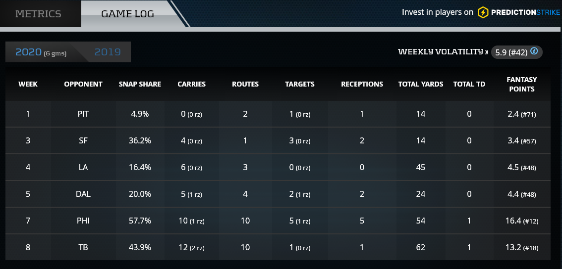 There are times when we can learn much about a player and his potential even when the stats don’t back it up. In a Week 9 contest against the Ravens where we knew passing yardage would be hard to come by for the Colts, Michael Pittman emerged as a go-to option for Philip Rivers. We already know the schedule eases up, and we know T.Y. Hilton no longer has the juice. It’s time to stash Pittman in advance of the inevitable blow-up game.
