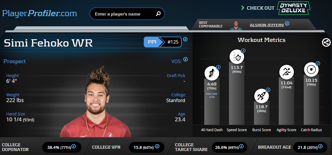 In other player movement news, Simi Fehoko makes his first appearance in an Underworld vs. RosterWatch mock. Though the stench of fellow Stanford alum J.J. Arcega-Whiteside‘s epic collapse still haunts many, it’s hard to ignore a 6-4, 222-pound receiver with a 95th-percentile Speed Score and Best Comparable Players that include Alshon Jeffery, Kenny Golladay and Courtland Sutton.