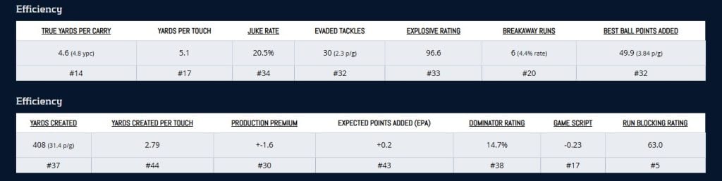You know where I’m going with this … if you can get peak value in return for Monangai, you might want to think about moving on from him. Yes, he’s averaging 4.8 YPC, but he’s been middling on the efficiency side of things:
