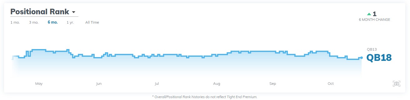 At the same time, as those two examples show — and there are countless others — a young QB’s dynasty fantasy football trade value can fall off a cliff very quickly. Now, Ward does carry some insulated value being the top pick. Even if he struggles the rest of the season, he’ll still be valued somewhere in the QB18-24 range going into the offseason because “draft capital” is a powerful illusion.