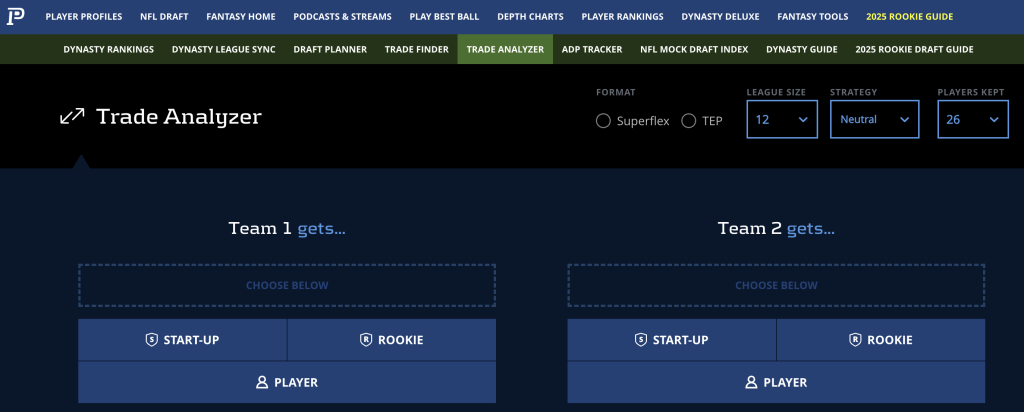 4. Use Trade Calculators: Tools like trade calculators can provide numerical values for players and picks, helping you gauge the Fairness of a proposed trade. However, remember that these are just guidelines, and context matters. PlayerProfiler’s Trade Analyzer is one of the best tools in Dynasty managers’ arsenals.