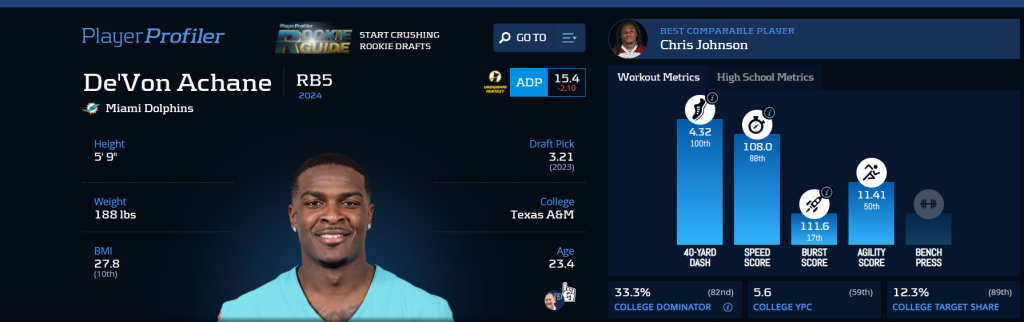 Achane’s usage in Miami’s passing game makes him an ELITE weapon among running backs.