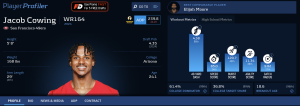 Jacob Cowing is owned in only 28 percent of Sleeper leagues. He was incredibly productive in college, amassing 244 receptions, 3,236 receiving yards, and 27 touchdowns in his final three seasons. His College Dominator Rating, target share, and Breakout Age all rank greater than the 96th percentile, respectively. It was a bit surprising to see the 49ers draft Cowing in the fourth round last year after adding Ricky Pearsall in the first round to a receiving room that already included Deebo Samuel and Brandon Aiyuk. But a year later, things look much differently in San Francisco.