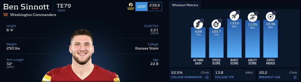 The 6-4, 250-pound Ben Sinnott boasts a remarkable athletic profile, featuring a 98th percentile burst score, a 95th percentile agility score, and a 96th percentile catch radius. For the bargain bin price of TE38 and a deep 2025 tight end class, Sinnott could be a mindless addition to larger trades that can boost the value of your dynasty rosters the moment the runway isn’t blocked by Ertz anymore.