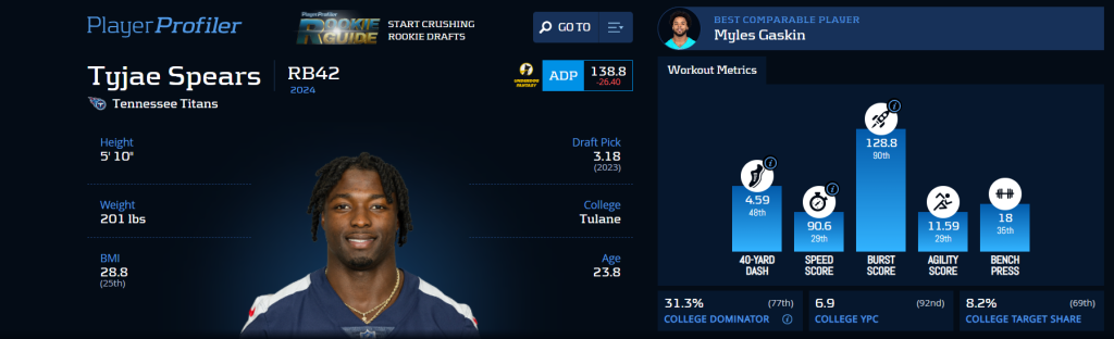 Tyjae Spears had an explosive end to 2024, particularly in weeks 15 and 16, when he shined after Tony Pollard ceded the reins. In week 15, he racked up 27.3 points, compiling 10 touches for 92 yards and two touchdowns. He finished as the RB3 that week and was a fantasy playoff hero. Spears followed up the next week by compiling 14 touches for 66 yards and another two touchdowns in week 16, finishing as RB10. He averaged an impressive 5.5 yards per touch from weeks 15-17. His performances in this stretch were game-changing for many fantasy teams. While Spears suffered an unfortunate concussion that curtailed his momentum, his prowess was evident.