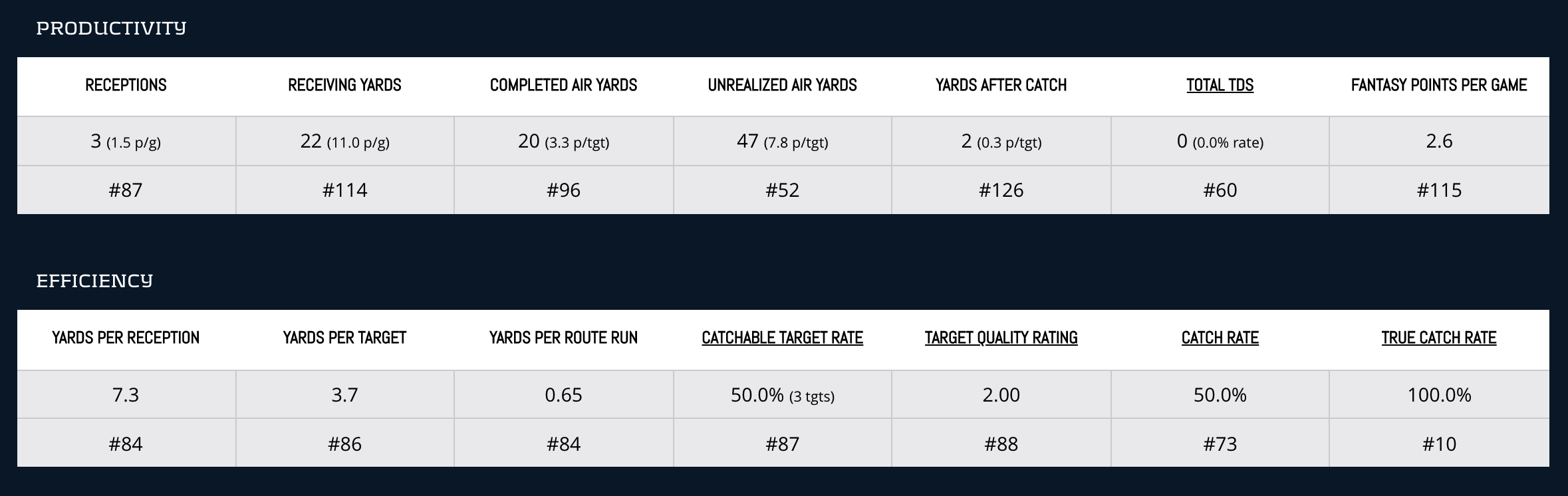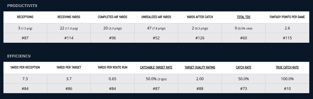Through two games, Pollard’s efficiency metrics are outstanding with top marks for True Yards Per Carry (6.9, No. 1), Yards Created Per Touch (5.22, No. 1), Juke Rate (47.8-percent, No. 4), and Evaded Tackles (11, No. 10). Pollard earns 12.09 Lifetime Value points to climbs six spots to RB24. Standalone value with immense upside, who doesn’t like that?