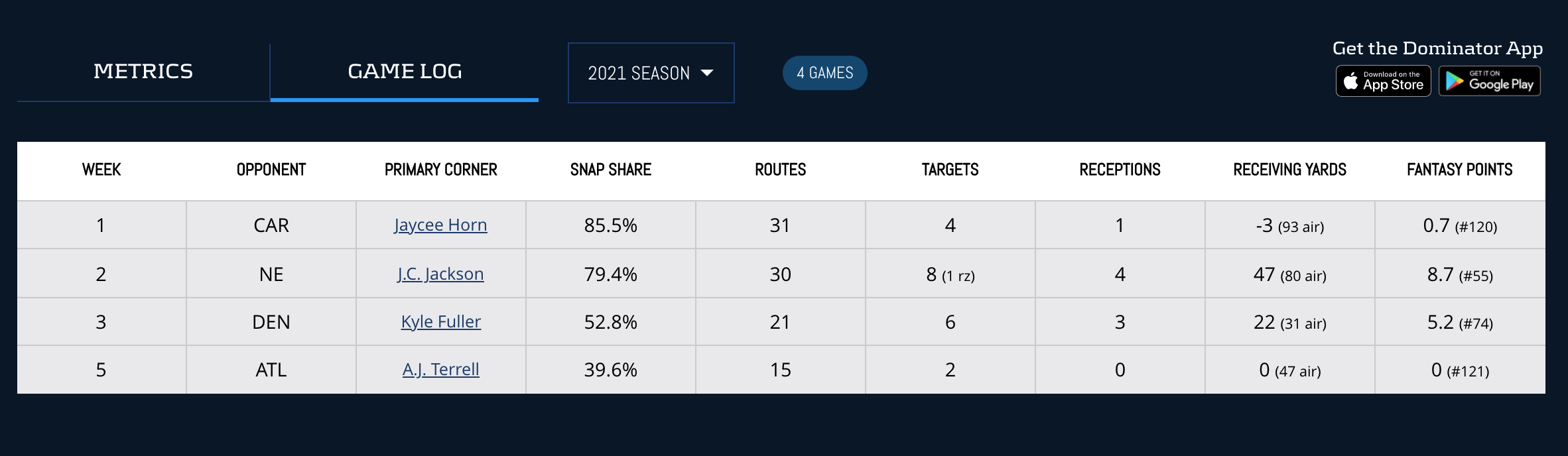 Injuries to the Giants pass catching corps opened up more opportunity for Kadarius Toney. Over the last three contests, Toney has averaged a Snap Share of 71.6-percent. Gifted with 4.43 (86th-percentile) speed and 135.2 (96th-percentile) Burst, the 2021 first rounder has made good use of this extra playing time.