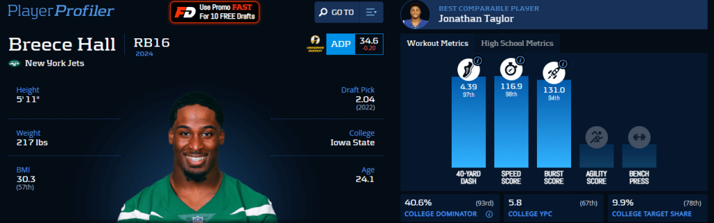 After finishing as the overall RB2 in PPR scoring in 2023 and seemingly on his way to stardom, Hall regressed last season. His attempts, rushing yards, catches, receiving yards, and TD total all slipped, and he finished as RB16, averaging 15.1 points per game.
