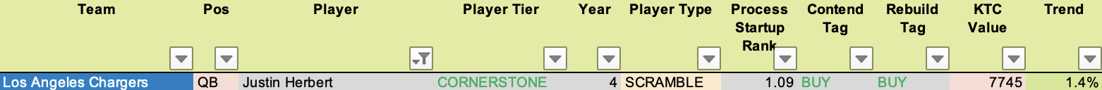 Herbert is one of just four quarterbacks to post multiple seasons of at least 24.0 points per game in their first four years. Only Patrick Mahomes, Josh Allen, and Lamar Jackson are in this category. Typically, when you get a chance to acquire a Cornerstone level player for cheaper than their profile suggests because of their situation, you should. This is because we know that situation changes a lot quicker than talent does. Therefore, Herbert is a player to target in Dynasty Trades.