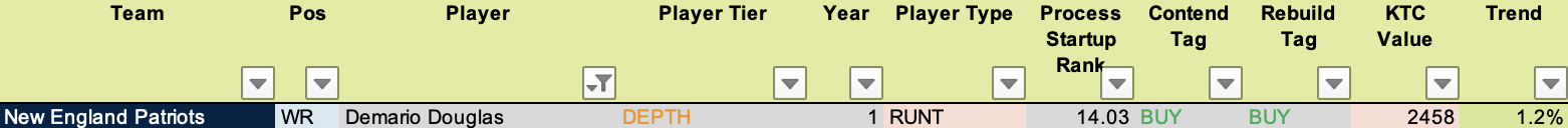 Based on player value and process rank, it may not seem like DeMario Douglas is much of a buy. However, he is. While you shouldn’t have full conviction on a Day 3 player who didn’t have extremely strong per game peripherals, what he did on a per route basis shows that there are plenty of possibilities to pay off at his cheap cost.