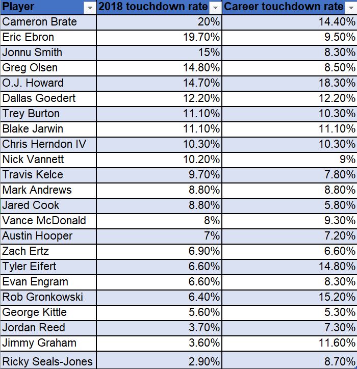 I’m not sold on George Kittle’s touchdown production exploding in 2019 after racking up a million yards, particularly after the catch, and a measly five touchdowns in 2018. He caught two touchdowns in 2017 on 43 receptions — a 4.6-percent touchdown rate. It’s not as if he didn’t have red zone opportunity last year: he saw 21 targets inside the 20-yard line, the fourth-highest total among tight ends. From inside the 10-yard line, he saw eight targets.