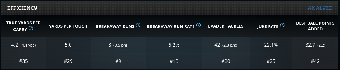 Here we find ourselves again. Devin Singletary is still the highest-usage back in what might be the best offense in the NFL. He is getting touches and running routes every week. But there are two issues in his profile. Despite a healthy percentage of Breakaway Runs at 5.2-percent (No. 13) and a decent 22.1-percent (No. 25) Juke Rate, Singletary has only managed 4.4 yards per carry. This is mostly due to a 62.9 (No. 59) Run Blocking Efficiency mark. He also has not seen enough red zone usage with 1.8 touches there per game.