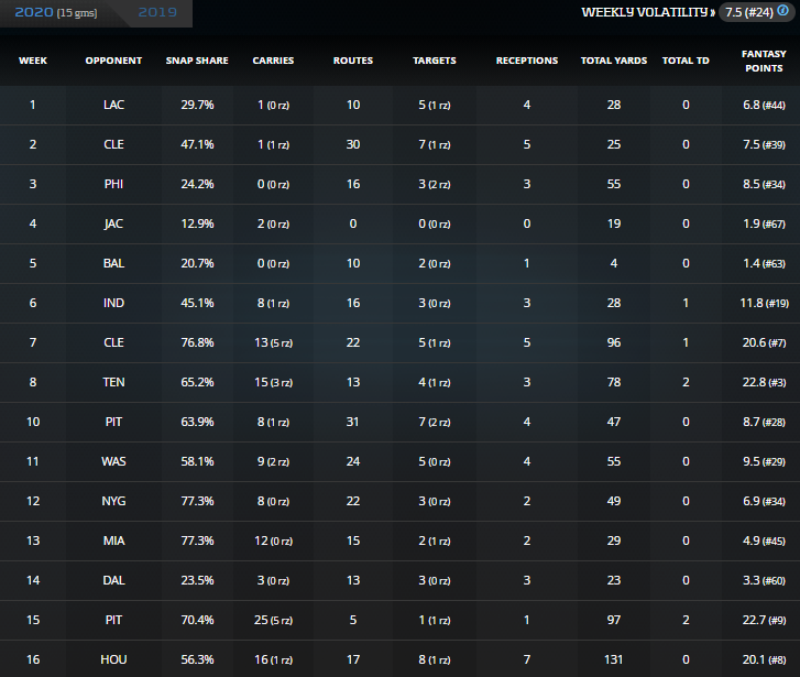 Chase Edmonds is another secondary back that has been seeing consistent work. He has done most of his damage through the air with consistent routes and targets regardless of whether Kenyan Drake has been active. Last week was a low point for Edmonds with no carries and only a 20.8-percent Snap Share, but he will likely bounce back to normal usage in Week 17. We should expect 5-10 carries and double-digit routes. The matchup against the Rams limits his upside in that role though. The Rams have one of the best defenses in the NFL this year and the game will likely provide a high-scoring environment to chase in DFS. Edmonds should be faded even with his price dropping.