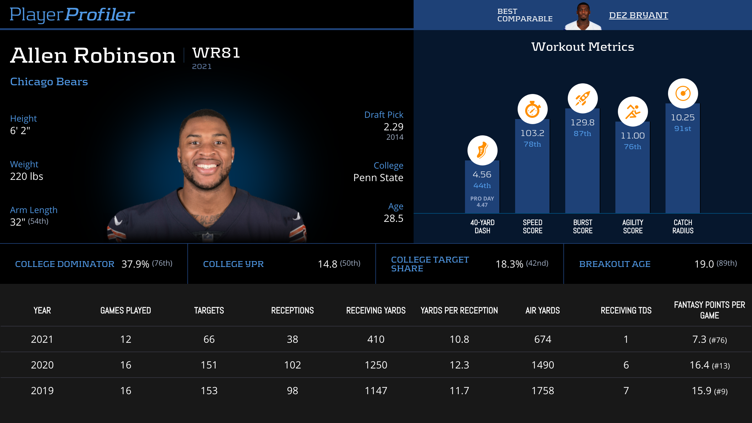 In 2021, Edmonds eclipsed a 50.0-percent Opportunity Share for the first time in his short career. That led to his first top 24 finish on a points per game basis in fantasy football. That sounds like the floor in Miami. Currently he’s ranked as PlayerProfiler’s dynasty RB39. He has ground to make up if he is going to crack the top 20.