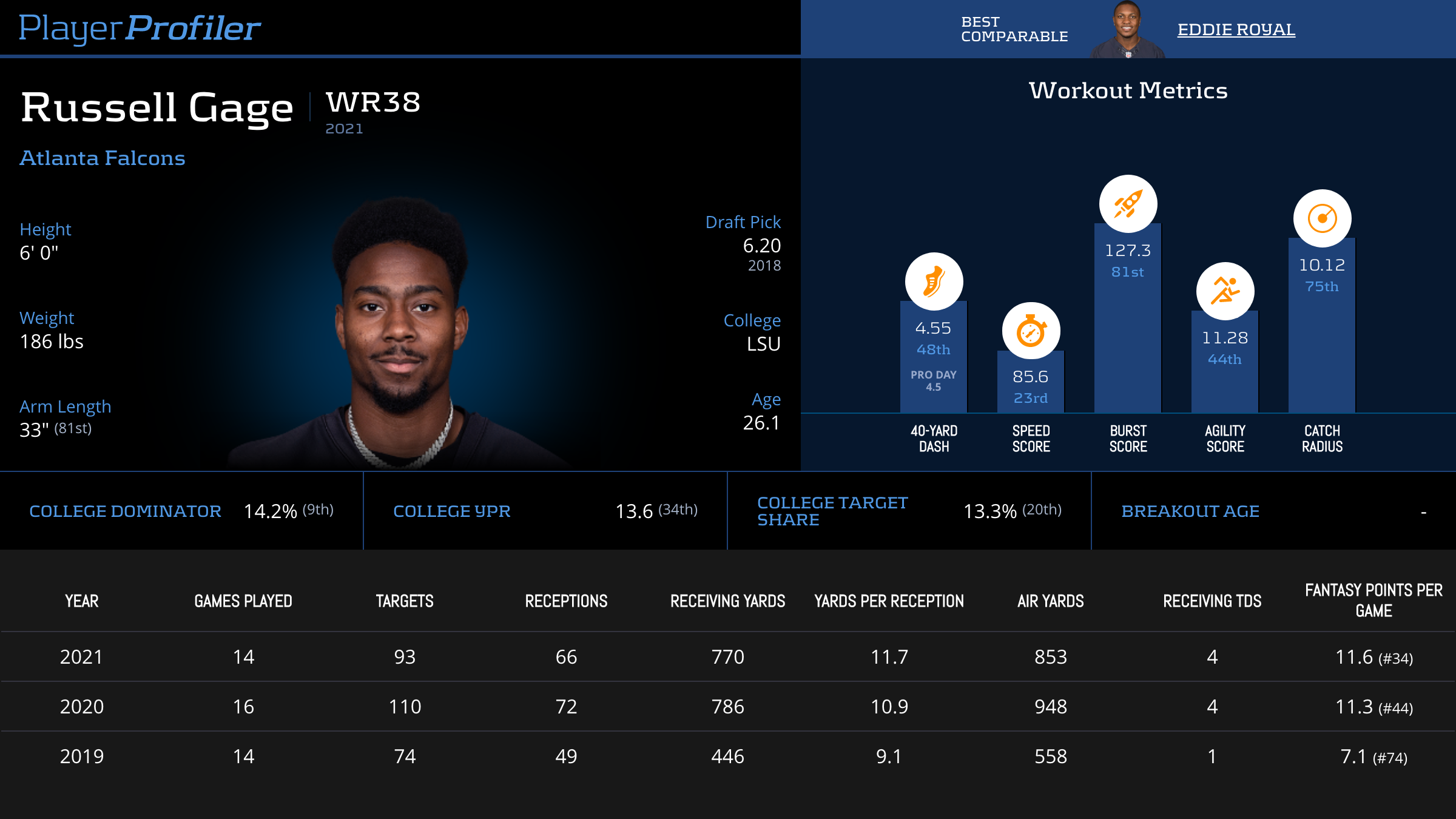 Over the past two seasons, Gage has seen 203 targets, caught 138 of those targets for 1,556 yards and added eight touchdowns. The former Atlanta wideout averaged 11.5 points per contest in PPR formats in that same span. He is a more talented wide receiver than most team builders realize. Last season, he logged a 29.2-percent (No. 16 among qualified wide receivers) Dominator Rating, 71.0-percent (No. 14) Catch Rate, and 2.19 (No. 13) Yards Per Route Run. The Buccaneers gained a legit pass catching weapon.