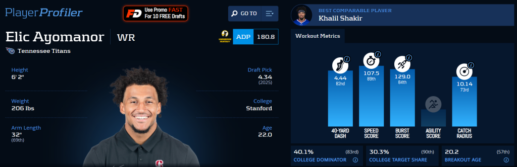 Elic Ayomanor has a real chance to make an impact as a rookie, even though he was a fourth-round pick. He’s got the physical tools to do so, and the early reports from OTAs are that Ayomanor is lighting it up. Right now, Ayomanor is practically free in drafts. Given that he has a good chance to be his team’s WR2, that’s too cheap. He’s an easy way to add big upside potential to your wide receiver core.