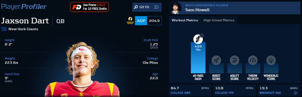 Jaxson Dart is more of a best ball or Superflex play, where drafting multiple quarterbacks is a must, since you may not be able to rely on him to start the season. But with his running ability and aggressive play style, there’s a better chance than people realize that Dart could be a streaming-level quarterback as a rookie. Dart has real potential as a rookie, and I want that potential on my team.