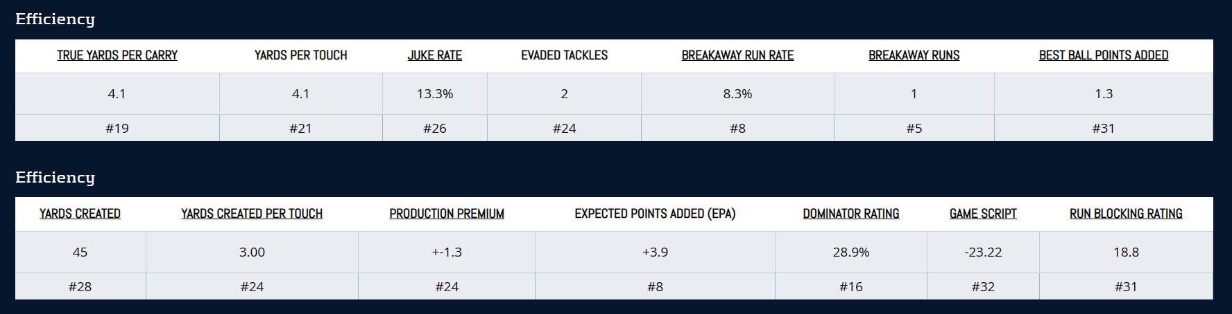 He could once again struggle with efficiency upon his return, which could hold him back from top 5 overall upside. Barkley looks for the home run every time he touches the ball. In 2022, he had 18 Breakaway Runs but still finished No. 34 in yards per touch. Barkley is a boom or bust rusher in this league. If he’s not 100-percent, then his fantasy production will likely suffer as a result without the same big play ability.
