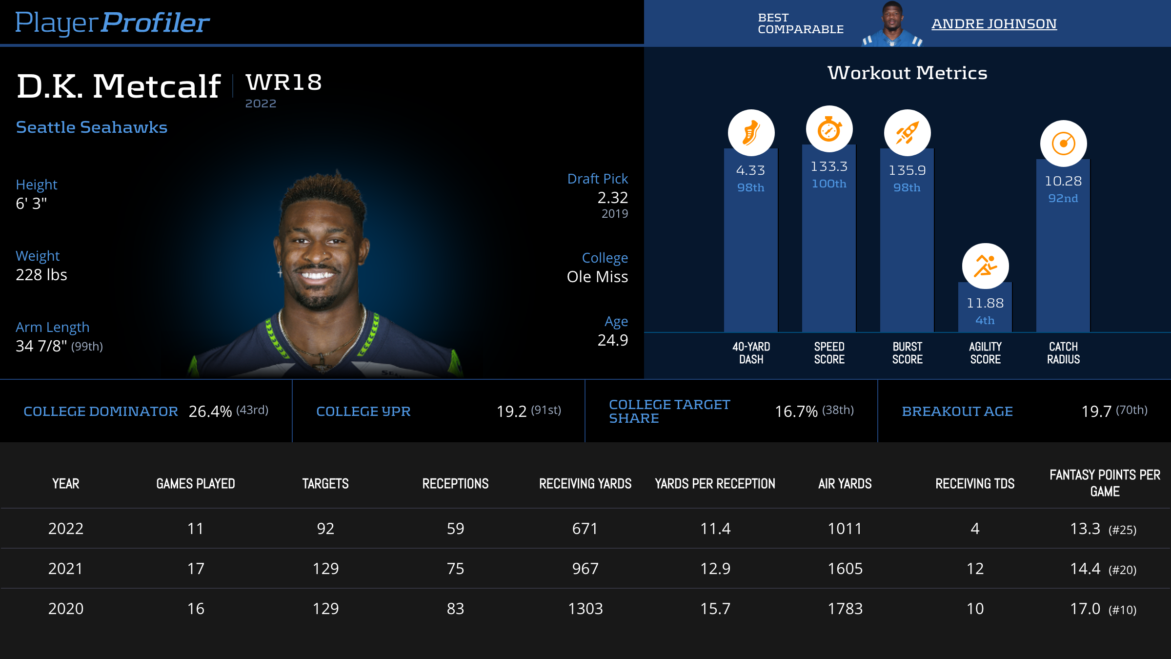 The Fantasy Supermarket is a place where fantasy team builders can find deals. Discounted players that are poised for some big games ahead or talent profiles that are exciting, but the stats haven’t been there. But sometimes the supermarket has a player that is just so good that they are worth buying even at a high price. DK Metcalf is that dude. Despite ranking as WR 18 overall, Metcalf is WR 25 on a points-per-game basis. That difference is enough to potentially open the slightest of buy windows. It will not lower the price, but that is okay because if he was a top-10 wide receiver he wouldn’t even be available.