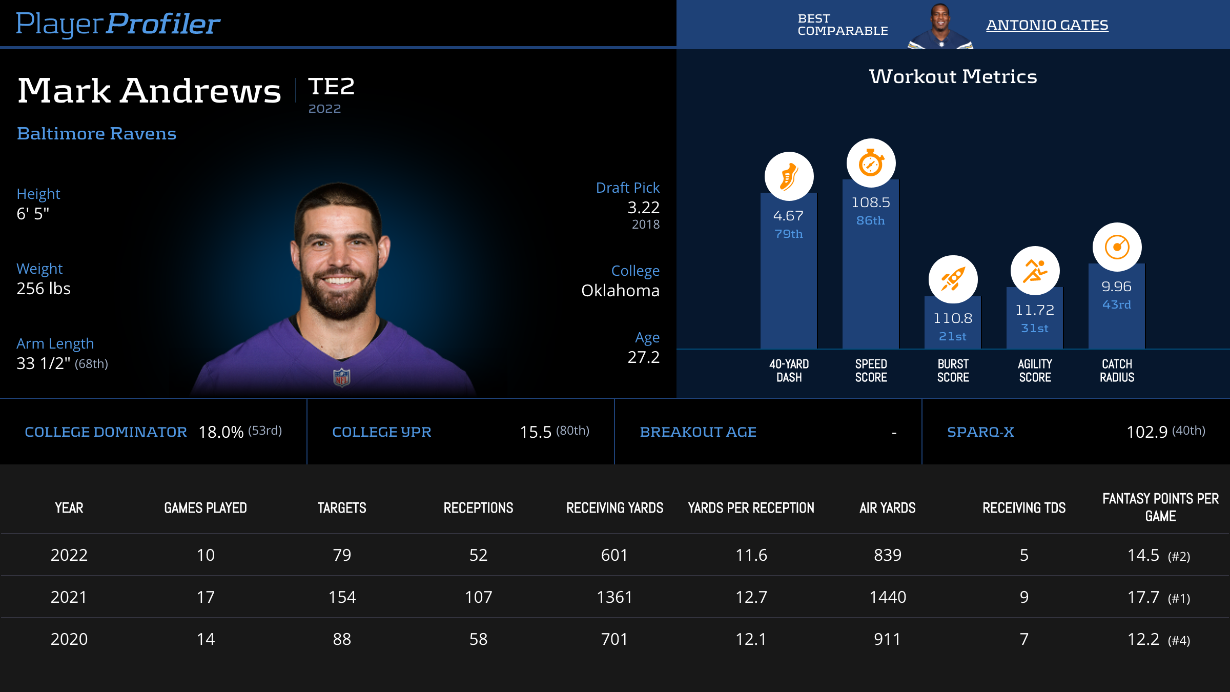 Even with the lack of production, Andrews still has a 28.9-percent Target Share (No. 1 among qualified tight ends), a 32.4-percent Air Yard Share (No. 2), a 2.25 Yards per Route Run (No. 3), and 16 Red Zone Targets (No. 2). His 407 Unrealized Air Yards is the No. 2 most for tight ends. His practice reports have been clean for a couple of weeks in a row and that should indicate that he is getting closer and closer to being fully recovered from his multiple ailments. Lamar Jackson and the Baltimore Ravens will need Andrews to make a push for the postseason, and that will be a massive advantage for fantasy teams that roster the tight end.