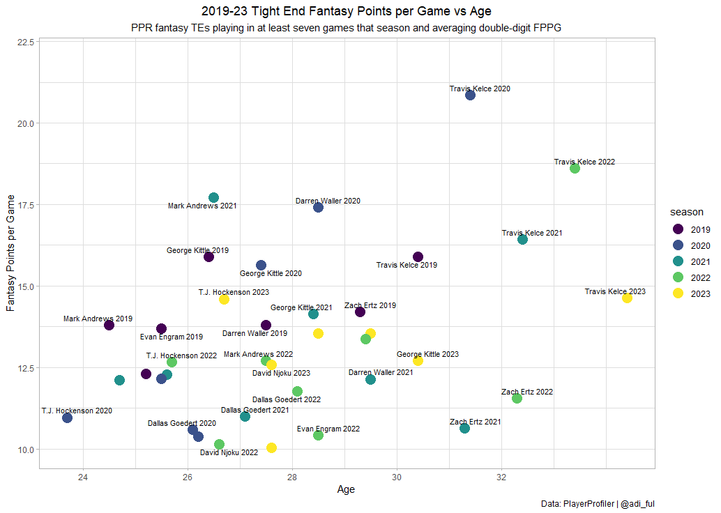 While it seems like a potential age apex for TEs would come in later years, the data is skewed due to repeat finishers. Kelce has a whole corner of the plot to himself. Kelce, George Kittle, and Andrews averaged double-digit fantasy points all five seasons of the data.