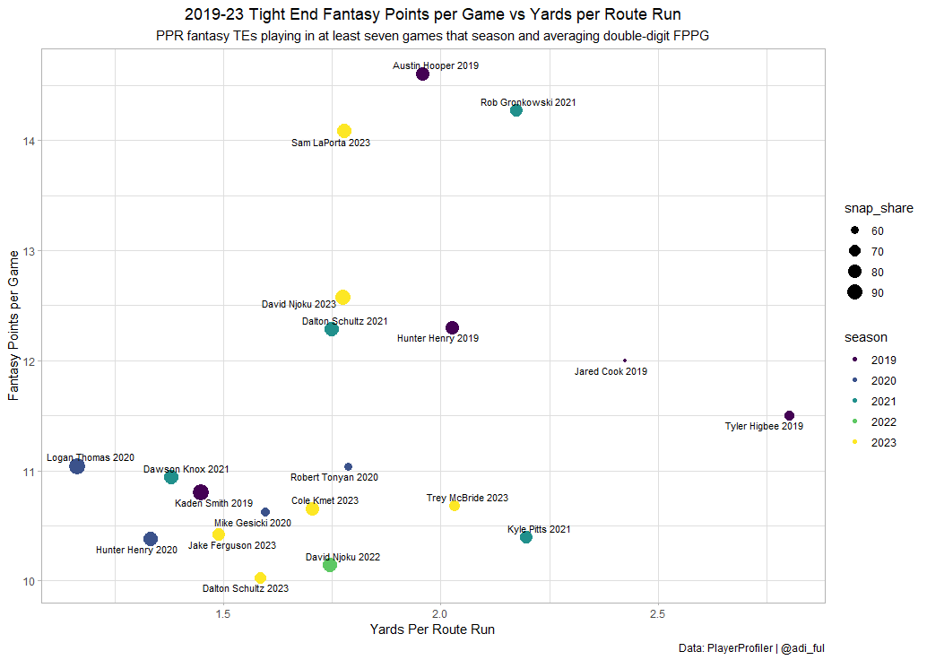 The players higher on the plot in FPPG have a bit higher YPRR, though the relationship is not definitively strong. Some with lower YPRR have higher Snap Shares – Logan Thomas, Dawson Knox, Hunter Henry. So, we want tight ends who are consistently on the field and get targets past the basic shallow middle-of-the-field looks.