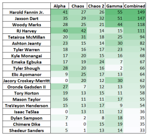 When I looked at the top 100 appearances by player across all four tournaments, three guys were the true cross-tournament constants: Dart, Fannin, and Woody Marks. Those were the only players that were basically “must-haves” across all four tournaments, as they were heavily represented in the top 100 builds in every tournament.