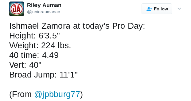 When I hear the name Ishmael Zamora, I think of a wide receiver who has a name of somebody sent from another galaxy to planet earth to dominate the gridiron. That’s not a knock on his name whatsoever, his name literally sounds like that of a superhero. You could argue that my Ishmael Zamora superhero theory only came closer to being proven when the 6-foot-4, 224-pound wide receiver clocked a 4.49 40-yard dash time at his pro day, while also posting a 40-inch vertical leap and 11-foot broad jump.