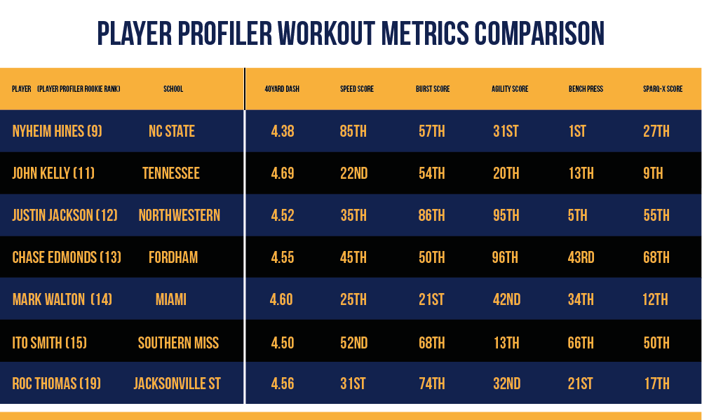 Below is a table that has seven running backs, including Ito Smith, sorted by their current PlayerProfiler ranking. These are all backs who have complete workout metrics and are unlikely to be drafted in the first three rounds.