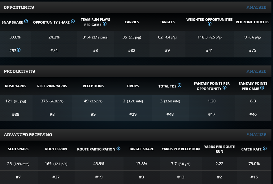 As was the case with both Minnesota and Carolina, Seattle’s narrow pass-game distribution was expected to work in Metcalf’s favor. Once again, the receiver on the other side of the formation had something to say about that, in this case it was the equally as good and equally as volatile Tyler Lockett. We still have Metcalves (editors note: bad nickname?) posted up as the top WR in our dynasty rankings, and a top 3 finish is absolutely in his future.