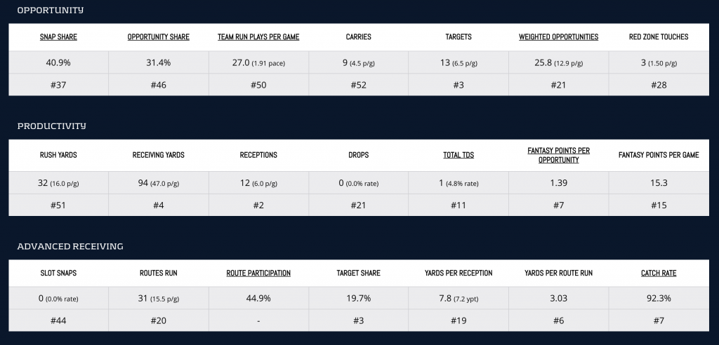 Uncle Lenny’s touch efficiency has gone up since last year. His 8 (No. 16) Evaded Tackles and 27.6-percent (No. 14) Juke Rate show promise. All that’s needed is one solid rushing week for his value to shoot up to where it should be. Don’t let that week pass by before you get him on your roster. Tampa Bay is lethal, and you want the bell-cow back on a lethal offense. You want him on that wall, you NEED him on that wall. That’s right, a 22-year old just laid down a reference from A Few Good Men (editors note: well done).