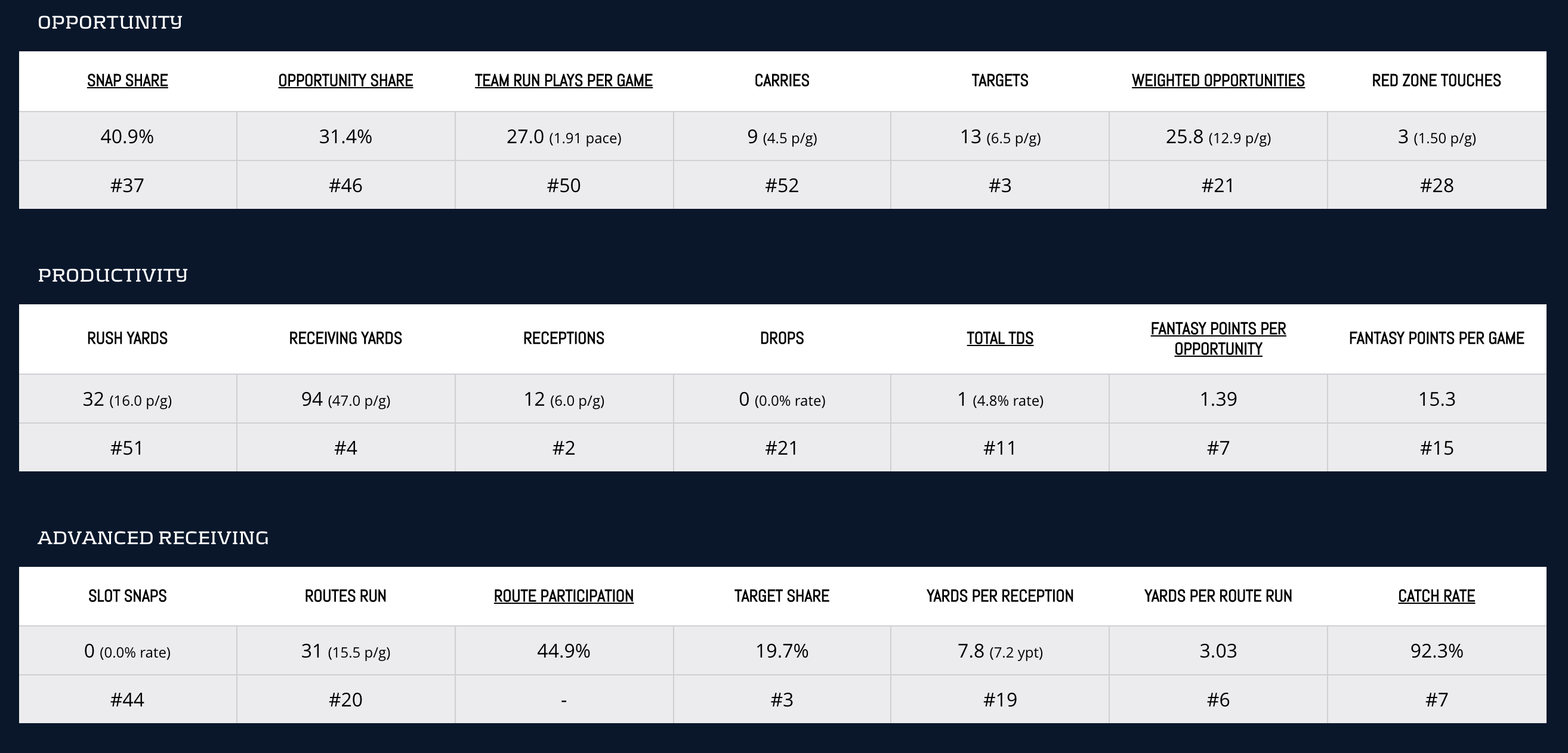 So far White has compiled a 19.7-percent (No. 3 among qualified running backs) Target Share (with a 72.2-percent backfield Target Share) and a 31.4-percent (No. 46) Opportunity Share. This is great usage for the bonafide pass-catching back. He’s a depth piece, so his trade value shouldn’t be too much. You may even be able to swindle a deal for a replaceable, low-end WR3 to cement your RB room and lock down a solid floor play at flex every week.