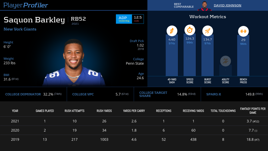 The road has been paved for Saquon Barkley to be the cheapest he’ll ever be in all formats. He’s two weeks removed from his ACL recovery, and drew two stout run defenses to start the season. While his performance thus far has been dismal, his 83-percent Snap Share and 70-percent Opportunity Share in his last outing show that he’s gearing back up to the type of workload we’re used to seeing out of him.