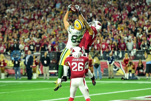 Aaron Rodgers likely missed Janis multiple times during the first half, because he had been accustomed to threading deep balls into James Jones‘ microscopic catch radius throughout the 2015 season. By the time the third quarter began, Rodger had recalibrated. Once Aaron Rodgers started hitting Janis in stride, Arizona defensive backs responded by grabbing and pulling on every region of Jeff Janis’ body, but somehow no penalty flags were thrown.
