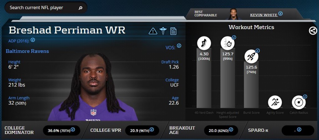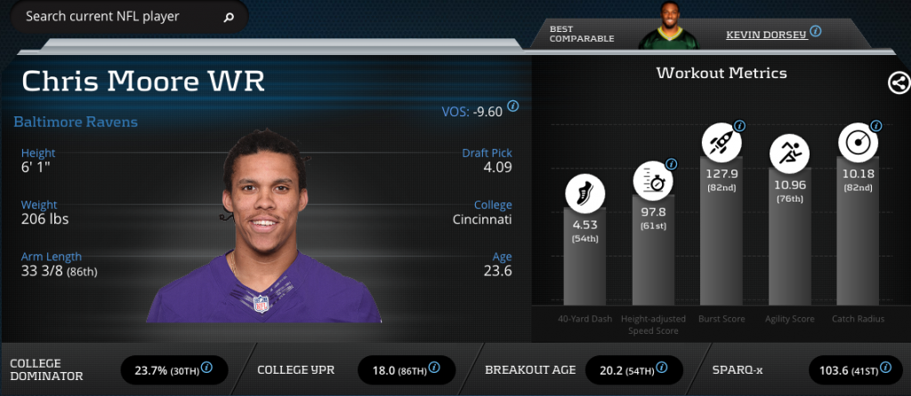 Chris Moore is another talented Ravens receiver who may see a spike in opportunity next season. Moore, like Breshad Perriman, is highly athletic, posting a 127.9 Burst Score (82nd-percentile), 10.96 Agility Score (76th-percentile), and a 10.18 Catch Radius (82nd-percentile). Like Perriman, Moore also flashed big play ability at the college level, where he averaged 18.0 yards per reception (86th-percentile) despite playing in a passing offense that was above average at best.