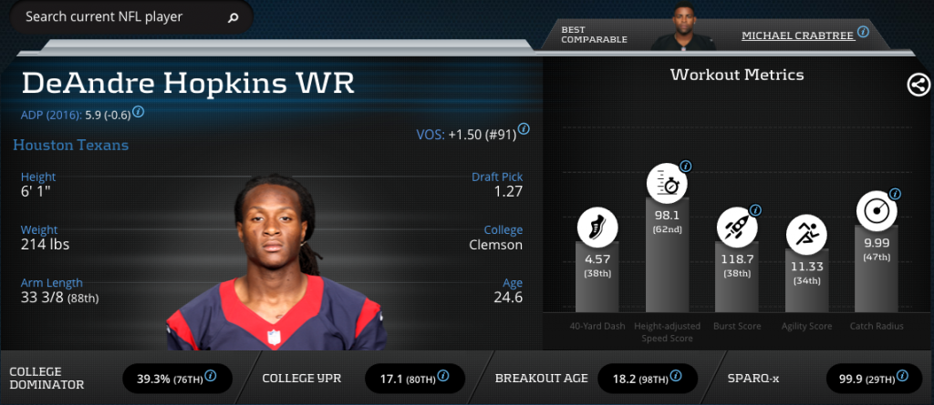 Helping DeAndre Hopkins become one of the least efficient wide receivers was Brock Osweiler, who posted one of the most inefficient seasons for an NFL quarterback of all time. Osweiler ranked 28th in the league in completion percentage (59.4-percent), 19th in Red Zone Completion Percentage (51.9-percent), and 35th in Deep Ball Completion Percentage (17.7-percent) and yards per attempt (5.7). Osweiler was brought in to be a game-manager, with the idea that he wouldn’t recklessly force the ball to Hopkins the way the Texans quarterbacks did in 2015, so it makes sense that Hopkins did not match his lofty 2015 statistics, but no one could have predicted this bad of a season. Even after posting 12.2 fantasy points per game in his age-24 season, Hopkins is an entrenched top-20 WR position on the PlayerProfiler Dynasty Rankings.